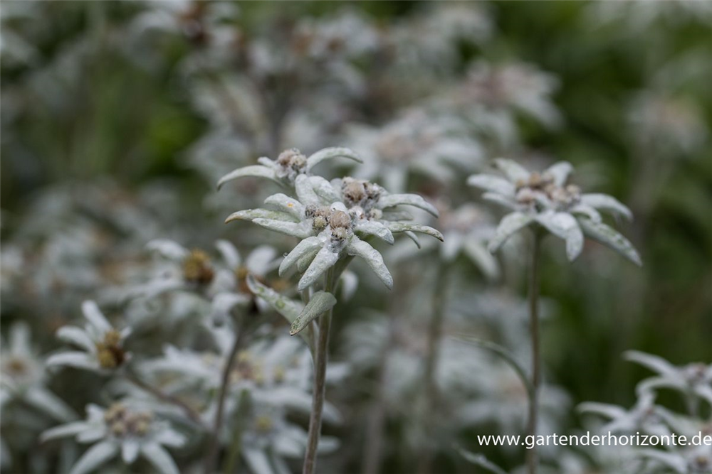 Leontopodium alpinum bildet sternförmige, silberweiße Blüten ab Juni.