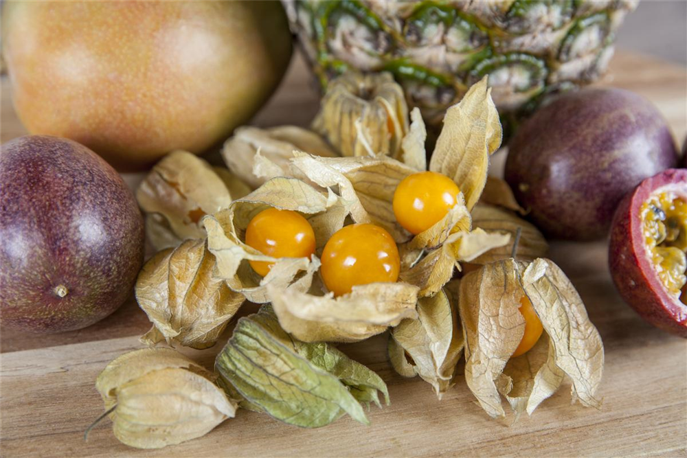 Die Andenbeere (Physalis peruviana) bildet gelbe Früchte. Sie haben einen süß-säuerlichen, aromatischen Geschmack. Für eine ertragreiche Ernte ab August schaffen durchlässiger, nährstoffreicher Boden und ein sonniger Standort optimale Bedingungen. Auch ihre weißen Blüten sind eine schöne Erscheinung.