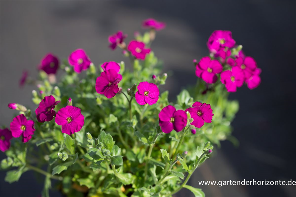Das Garten-Blaukissen 'Regado Red' (Aubrieta x cultorum) ist eine kissenförmige, polsterbildende immergrüne Staude, die von April bis Mai purpurrote, radförmige Blüten bildet. An einem sonnigen bis halbschattigen Standort mit humosem, nährstoffreichem Boden erreicht es gewöhnlich eine Höhe von ca. 15 cm und wird ca. 30 cm breit. Das Garten-Blaukissen 'Regado Red' ist an geschützten Standorten gut frostverträglich.