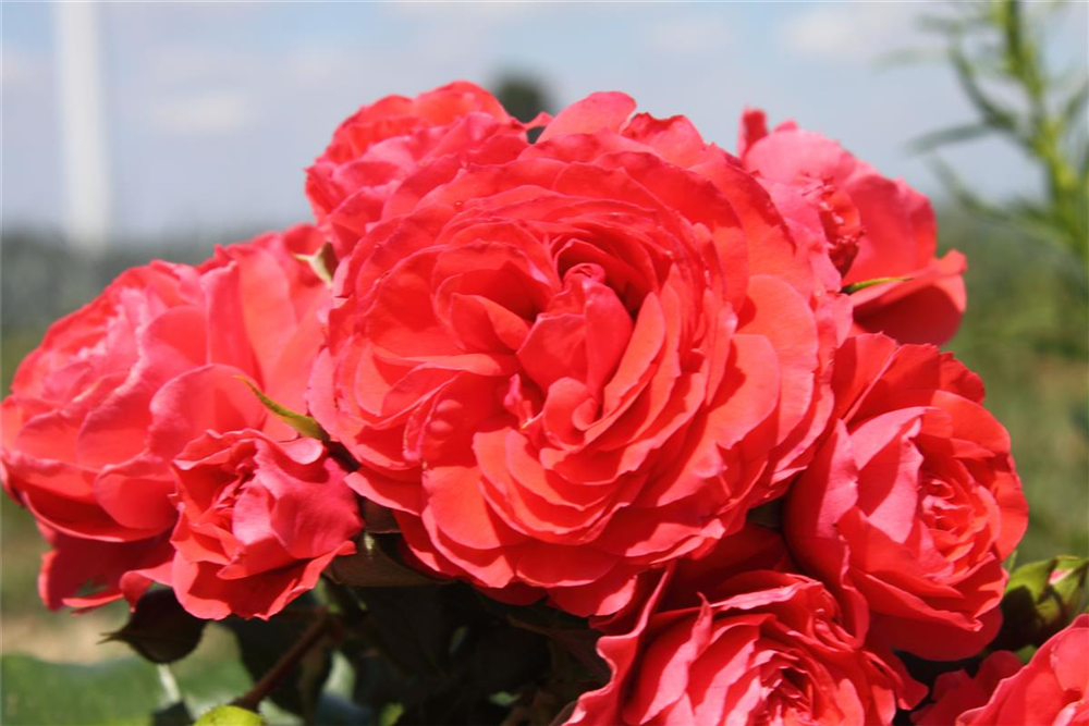 BlüteDie roten, gefüllten, schalenförmigen Blüten der Beetrose 'Cherry Girl'® erscheinen in Dolden von Juni bis September. Diese werden etwa 5 - 6 cm groß und sind angenehm duftend.