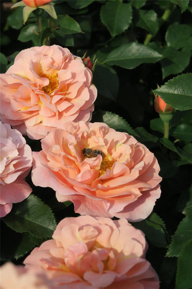 Die apricotfarbenen Blüten sind gefüllt und erscheinen von Juni bis September. Diese werden etwa 6 - 8 cm groß und sind angenehm duftend.
