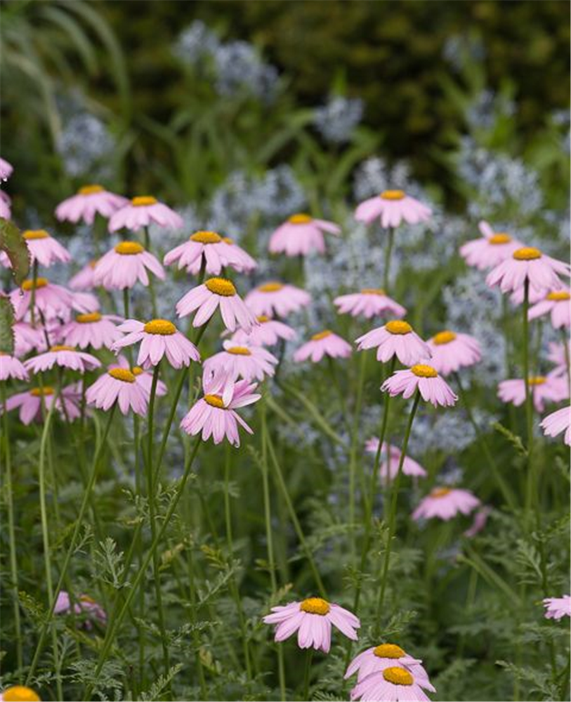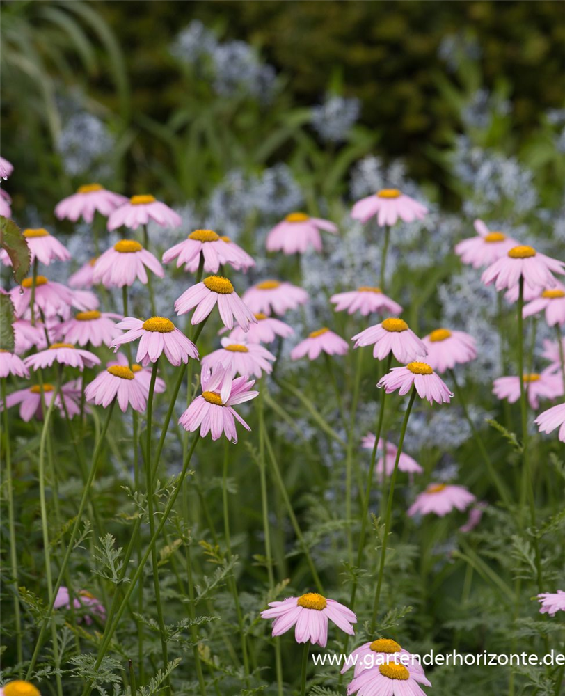 Tanacetum coccineum 'Robinsons Rosa' bildet körbchenartige, rosafarbene Blüten ab Mai.