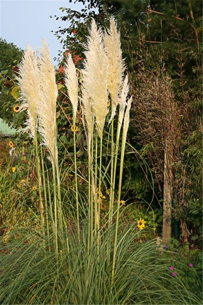 Das Pampasgras (Cortaderia selloana) ist mit seiner grau-grünen Blattfärbung ein dekoratives Gestaltungselement im Garten, welches sich an einem sonnigen Standort mit einem möglichst durchlässigen, humosen, nährstoffreichen Boden am wohlsten fühlt. Die weißen Blütenwedel schmücken die ausladend wachsende Pflanze ab Herbst. Bei günstigen Bedingungen erreicht dieses winterharte Gras eine Höhe von ca. 1,5 m und wird bis zu 1,5 m breit.