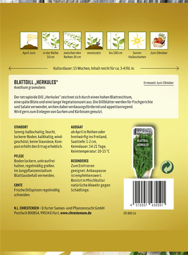 Der Dill 'Herkules' (Anethum graveolens) ist eine Kräuterpflanze mit einem würzigen Geschmack. Seine grünen Blätter sind tief geschlitzt. Für das optimale Wachstum des Dills 'Herkules' werden ein sonniger Standort und durchlässiger, nährstoffreicher Boden benötigt.