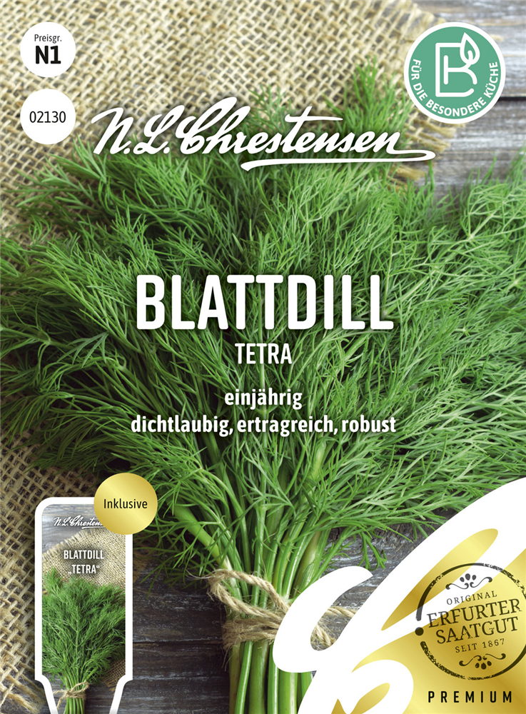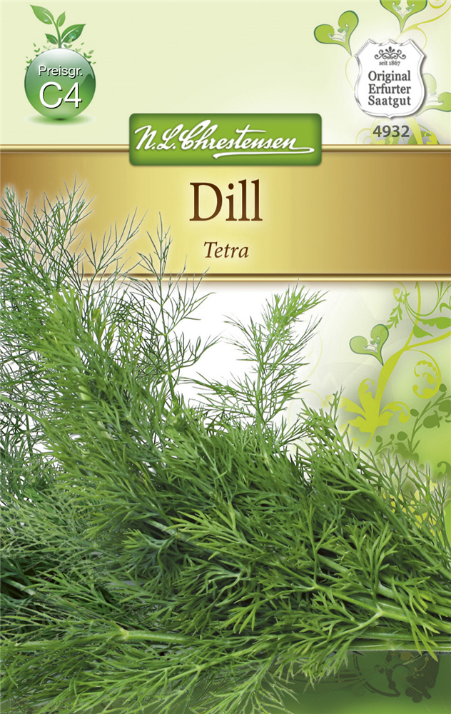 Der Tetra-Dill 'Tetra' (Anethum graveolens var. hortorum) ist eine Kräuterpflanze mit einem würzigen Geschmack. Seine dunkelgrünen Blätter sind tief geschlitzt. Für das optimale Wachstum des Tetra-Dills 'Tetra' werden ein sonniger Standort und durchlässiger, nährstoffreicher Boden benötigt.