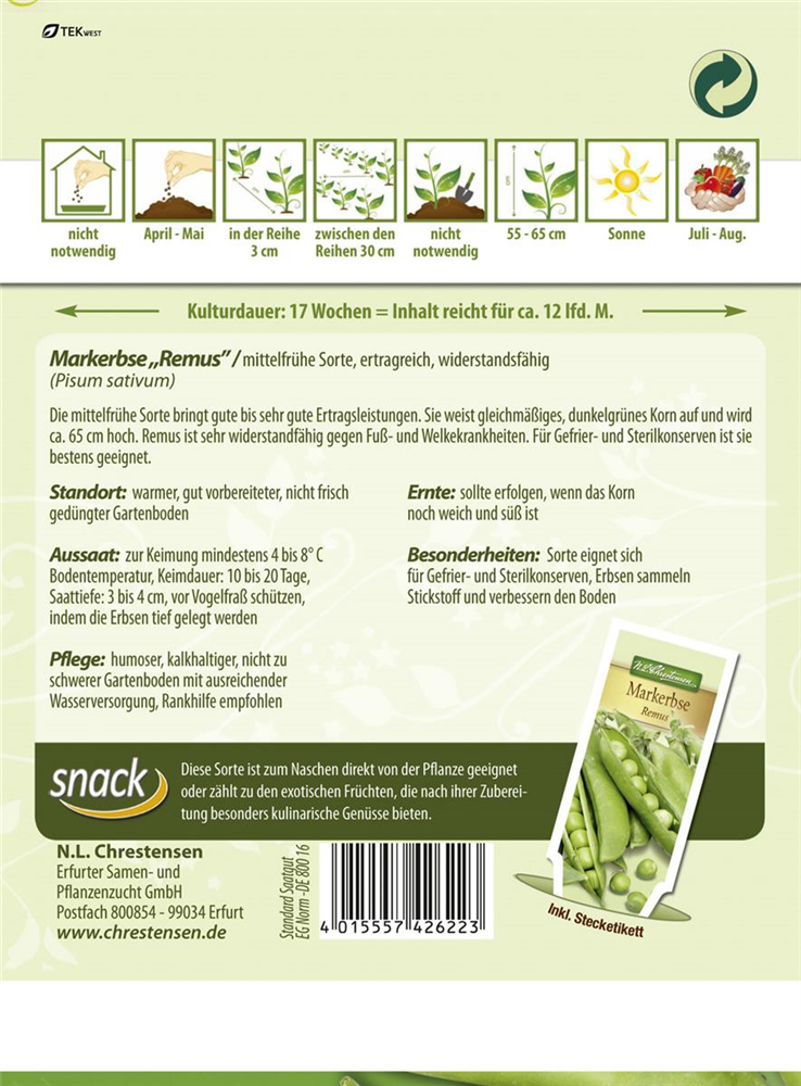 Die Markerbse 'Remus' (Pisum sativum) bildet Samenkörner, die süß, aromatisch schmecken und bereits ab Juli geerntet werden können. Für das optimale Wachstum der Markerbse 'Remus' werden ein sonniger Standort und durchlässiger, nährstoffreicher Boden benötigt.