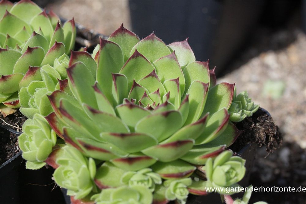 Der Hauswurz 'Birchmeier' (Sempervivum) ist eine polsterbildende, rosettenartige immergrüne Staude mit dekorativen, dickfleischigen, hellgrünen Blättern. An einem sonnigen Standort mit durchlässigem, lockerem, sandigem Boden erreicht er gewöhnlich eine Höhe von ca. 15 cm und wird ca. 20 cm breit. Der Hauswurz 'Birchmeier' ist an geschützten Standorten gut frostverträglich.