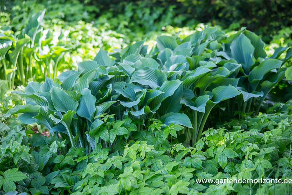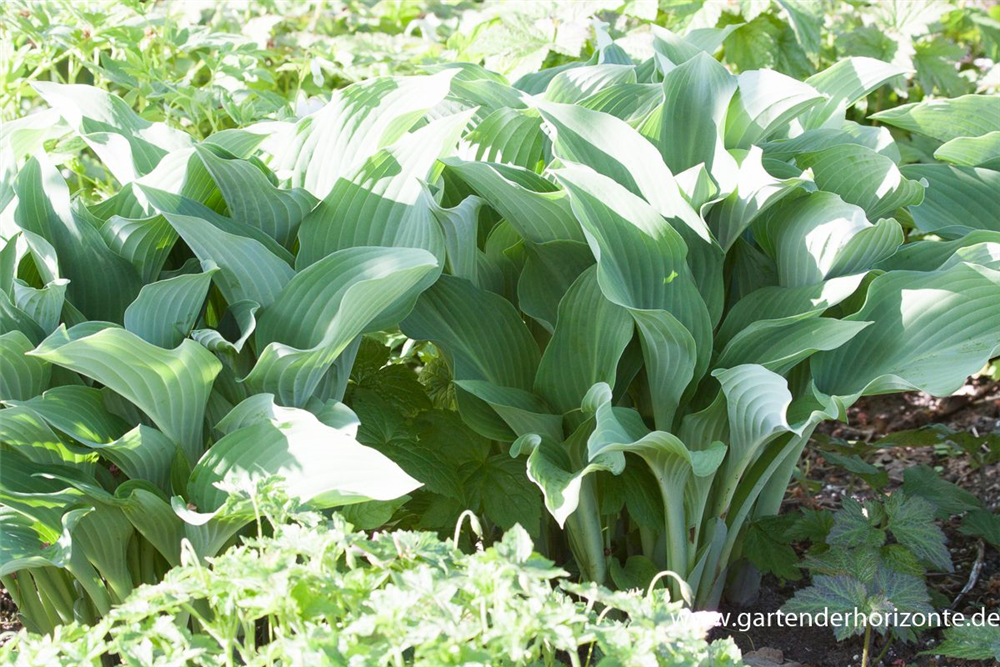Die Graublaue Garten-Funkie 'Krossa Regal' (Hosta nigrescens) ist eine horstbildende Staude mit dekorativen, herzförmigen, blau-grauen Blättern. An einem halbschattigen bis schattigen Standort mit durchlässigem, humosem Boden erreicht sie gewöhnlich eine Höhe von ca. 60 cm und wird ca. 60 cm breit. Die Graublaue Garten-Funkie 'Krossa Regal' ist gut frostverträglich.