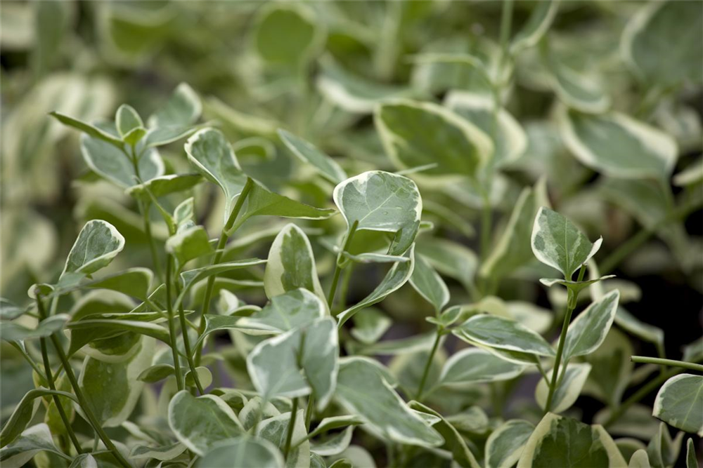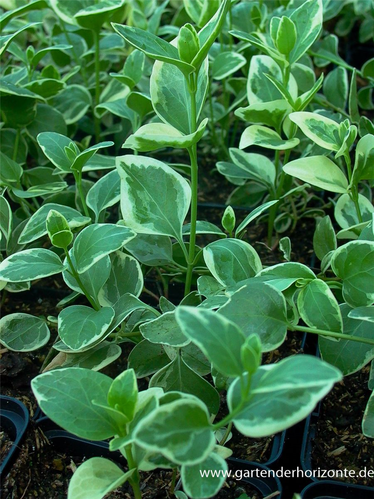 Buntblättriges Immergrün 'Variegata' ist ein kriechend und mattenbildend wachsender Halbstrauch, der eine Höhe von 30 - 40 cm und eine Breite von 40 - 80 cm erreichen kann.