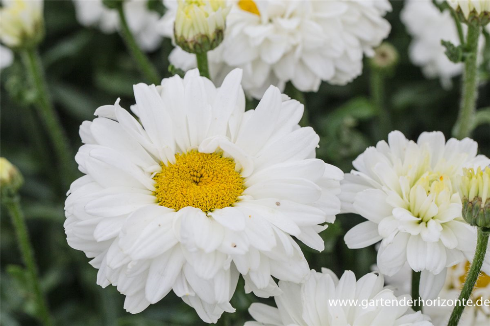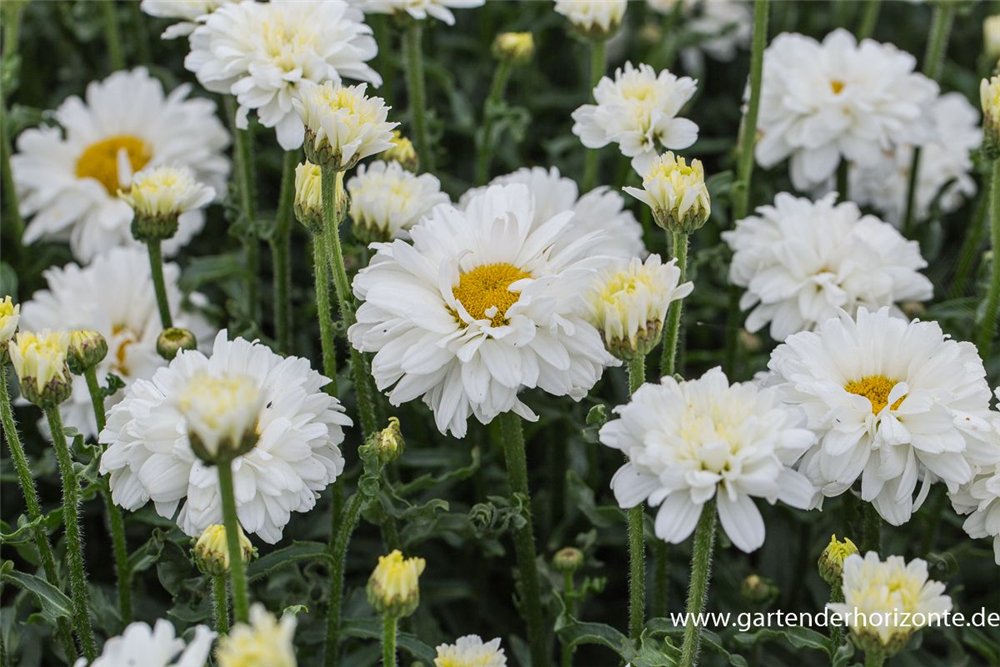 Die Großblumige Garten-Margerite 'Victorian Secret' (Leucanthemum x superbum) ist eine aufrechte Staude, die von Mai bis Oktober weiße, tellerförmige Blüten mit einem angenehmen Duft bildet. An einem sonnigen Standort mit durchlässigem, nährstoffreichem Boden erreicht sie gewöhnlich eine Höhe von ca. 90 cm und wird ca. 60 cm breit. Die Großblumige Garten-Margerite 'Victorian Secret' ist gut frostverträglich.
