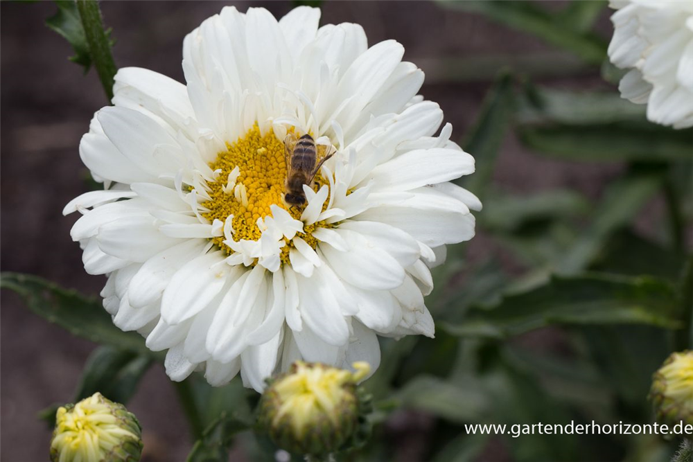 BlüteLeucanthemum x superbum 'Victorian Secret' bildet halbgefüllte, tellerförmige, weiße Blüten ab Mai. Diese verströmen einen angenehmen Duft.