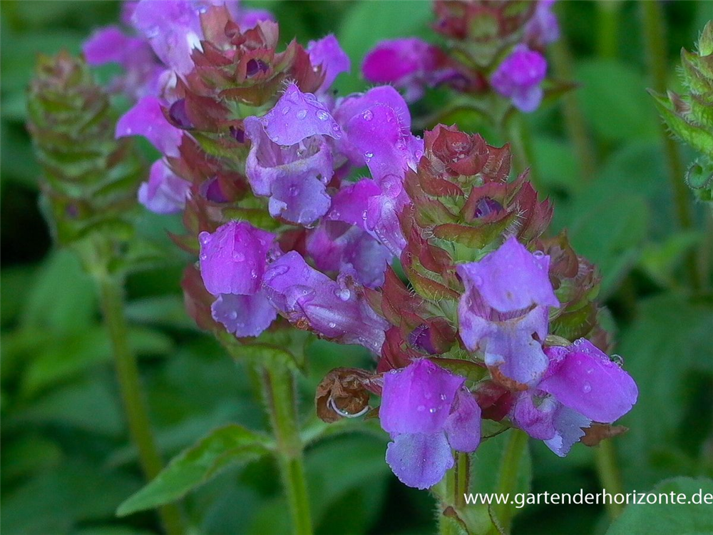 Prunella grandiflora bildet lippenförmige, in Ähren angeordnete, purpurviolette Blüten ab Juni.