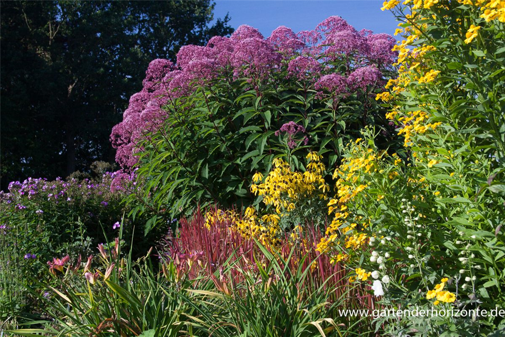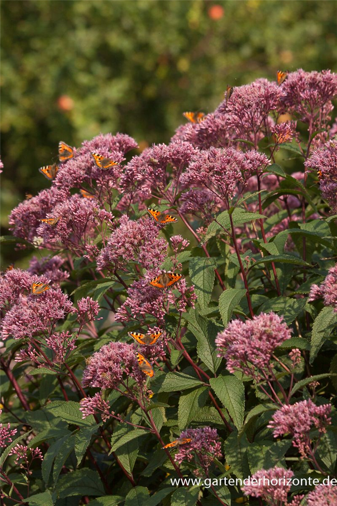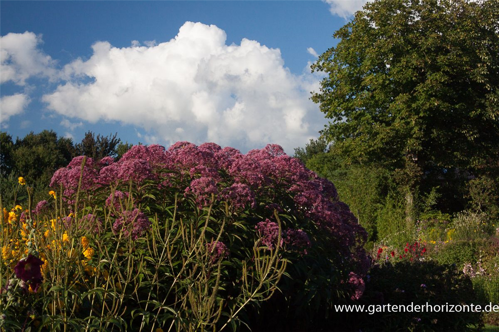 Der Große Garten-Wasserdost 'Glutball' (Eupatorium fistulosum) ist eine aufrechte Staude, die von August bis Oktober purpurrote, in Doldentrauben angeordnete Blüten mit einem angenehmen Duft bildet. An einem sonnigen bis halbschattigen Standort mit durchlässigem, nährstoffreichem Boden erreicht er gewöhnlich eine Höhe von ca. 2 m und wird ca. 1 m breit. Der Große Garten-Wasserdost 'Glutball' ist gut frostverträglich.