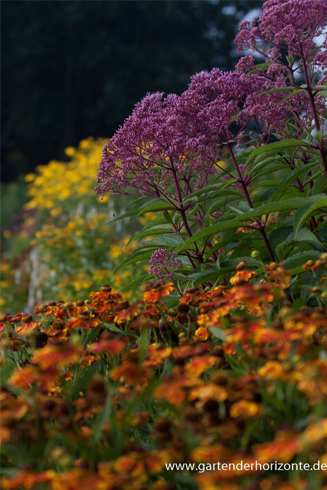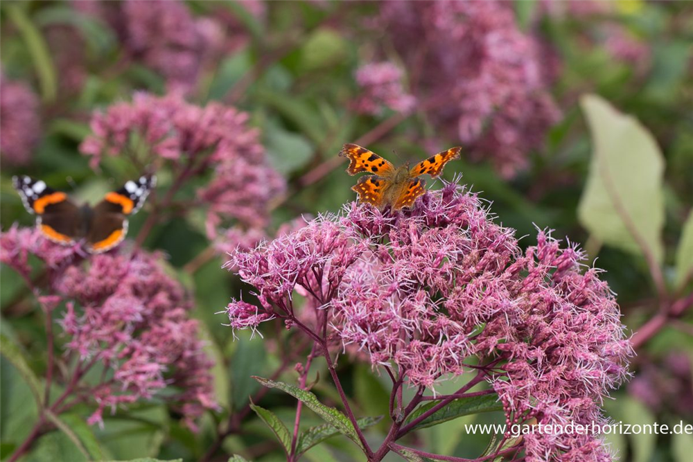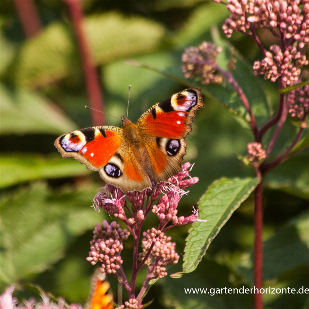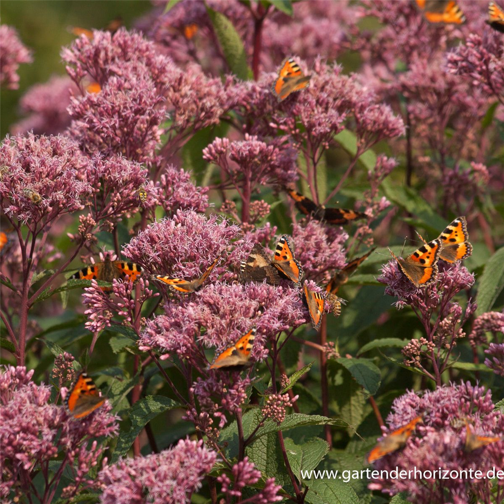 Eupatorium fistulosum 'Glutball' bildet in Doldentrauben angeordnete, purpurrote Blüten ab August. Diese verströmen einen angenehmen Duft.
