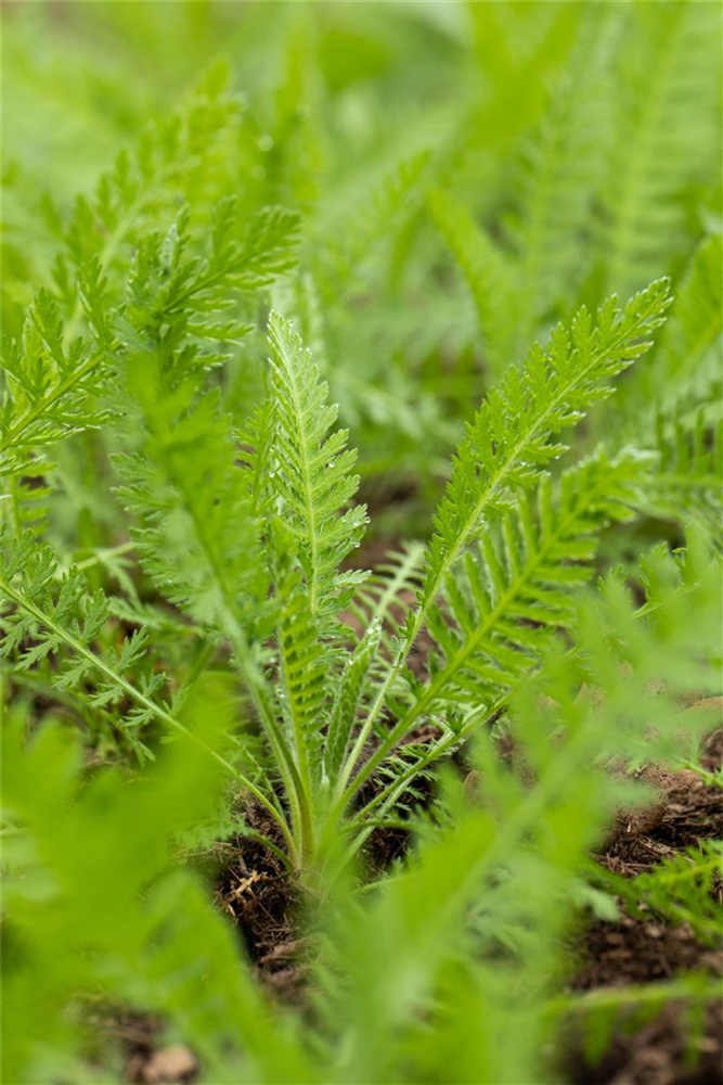 Die sommergrünen Blätter der Hohe Garten-Gold-Garbe 'Coronation Gold' sind grau-grün, gefiedert.