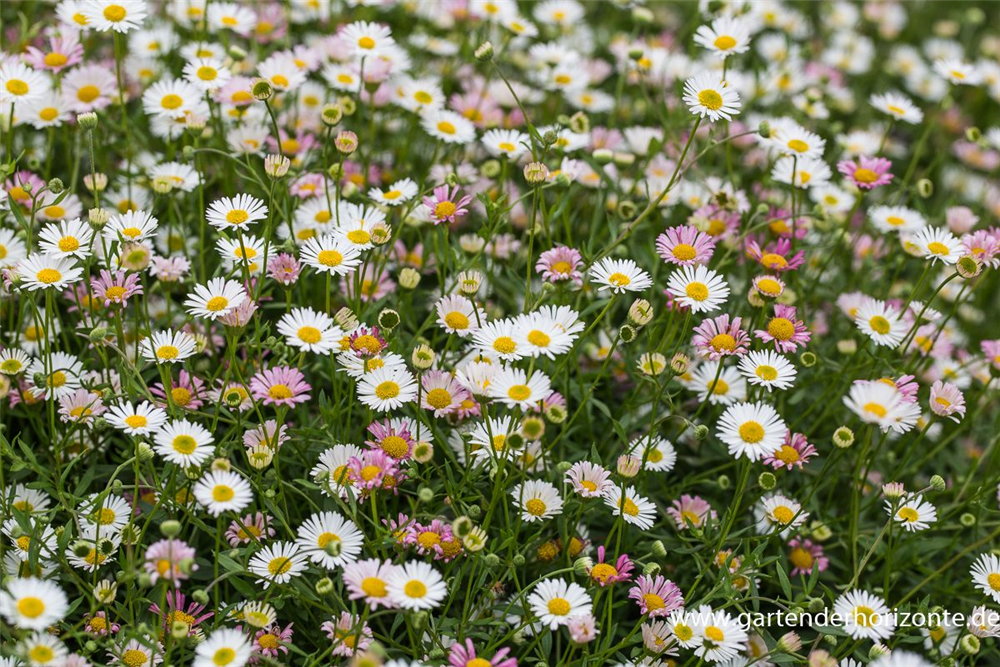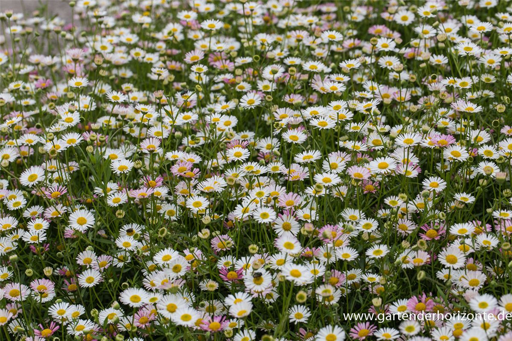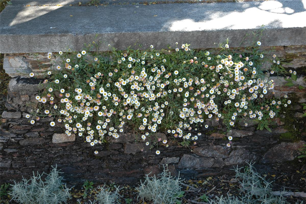 Der Karwinskis Feinstrahl (Erigeron karvinskianus) ist eine buschige Staude, die von Juli bis Oktober weiße Blüten bildet. An einem sonnigen Standort mit durchlässigem Boden erreicht er gewöhnlich eine Höhe von ca. 30 cm und wird ca. 30 cm breit. Der Karwinskis Feinstrahl ist gut frostverträglich.
