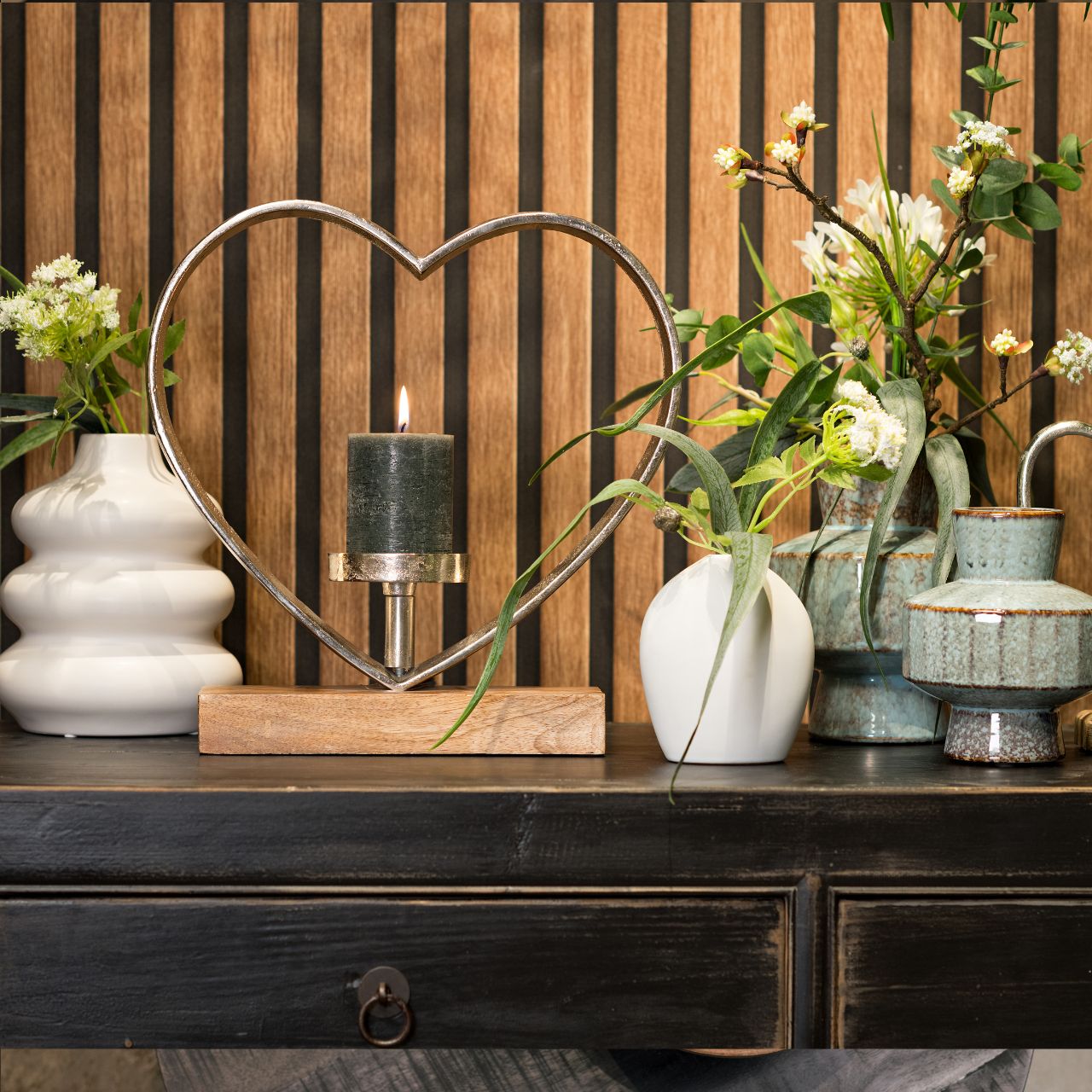 Eleganter Kerzenhalter in Herzform aus Metall auf einem Mangoholzsockel in Silber. Maße: 34x35x8cm. Farbe: Silber. Material: Holz. Hergestellt in Indien. Produktsicherheitsdatenblatt verfügbar unter: https://nextcloud.wurm.com/apps/psds/Documents/10026167.pdf.