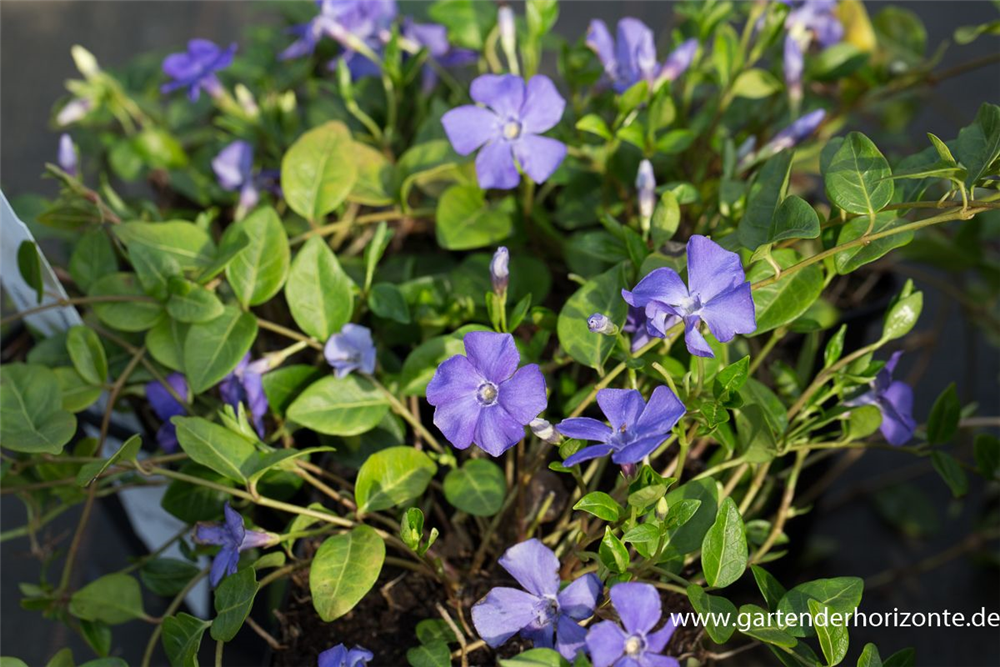 Das Kleine Garten-Immergrün 'Anna'(s) (Vinca minor) ist ein kriechender, teppichartiger Halbstrauch, der violette, radförmige Blüten hervorbringt. Sie erscheinen von Mai bis Juni. Bei richtiger Pflege blüht das Kleine Garten-Immergrün 'Anna'(s) erneut im September. An einem sonnigen bis schattigen Standort mit durchlässigem, humosem, lockerem Boden erreicht es gewöhnlich eine Höhe von ca. 30 cm und wird ca. 50 cm breit.