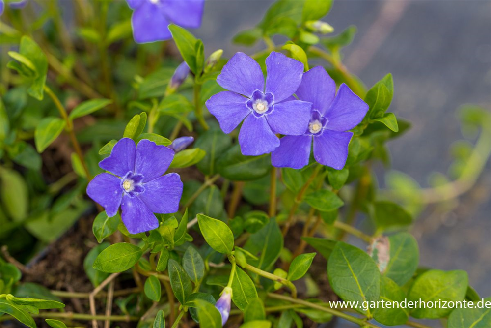 Vinca minor 'Marie'(s) bringt von April bis Mai blaue, violette, radförmige Blüten hervor.