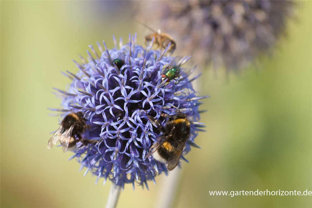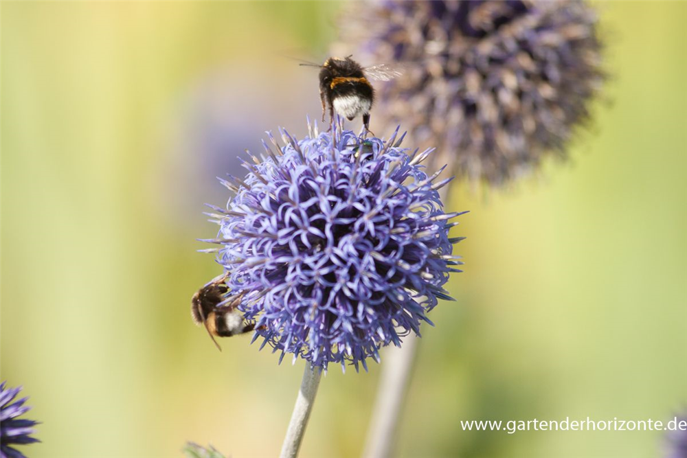 Die Kugeldistel (Echinops ritro) ist eine aufrechte Staude, die von Juli bis September blau-graue, ballförmige Blüten bildet. An einem sonnigen Standort mit durchlässigem, nährstoffreichem Boden erreicht sie gewöhnlich eine Höhe von ca. 1,2 m und wird ca. 40 cm breit. Die Kugeldistel ist gut frostverträglich.