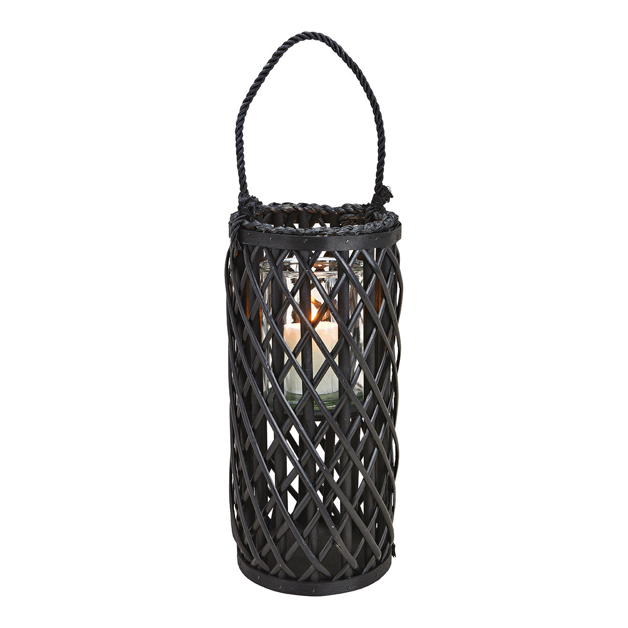 Laterne aus Weidengeflecht mit Windlicht aus Glas, hergestellt aus Naturmaterial in Schwarz (B/H/T) 18x40x18cm.
