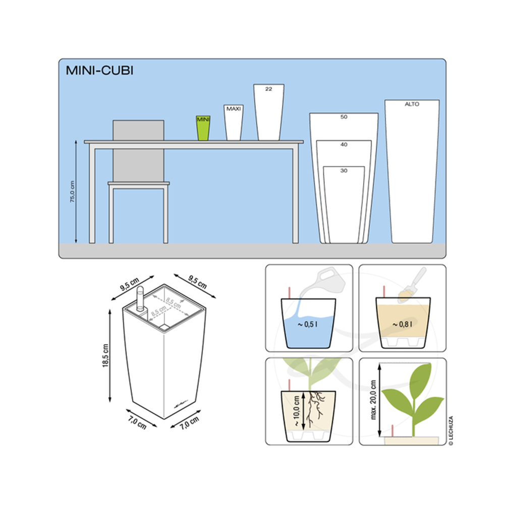 Die kubisch geformten Tischgefäße MINI-CUBI und MAXI-CUBI sind mit Blüh- oder Zimmerpflanzen bestückt eine stilvolle Dekoration für jeden Anlass. Als Blickfang in bunten Farben oder dezent in neutralen Tönen komplettieren sie kreative Arrangements auf der Festtafel oder sorgen für eine stets grüne Deko auf der Fensterbank oder auf dem Schreibtisch. Dank des integrierten Bewässerungssystems werden die Pflanzen zuverlässig mit der Menge an Wasser und Nährstoffen versorgt, die sie für ein gesundes Wachstum benötigen.