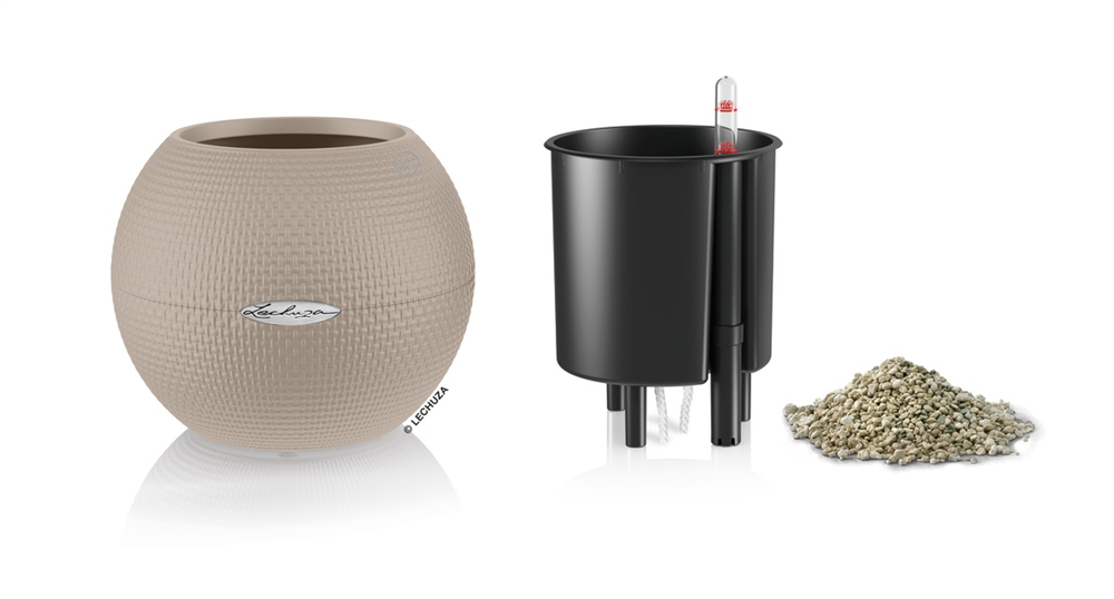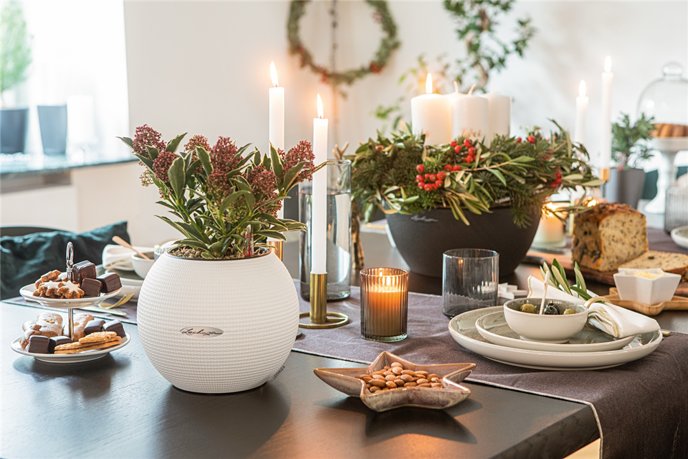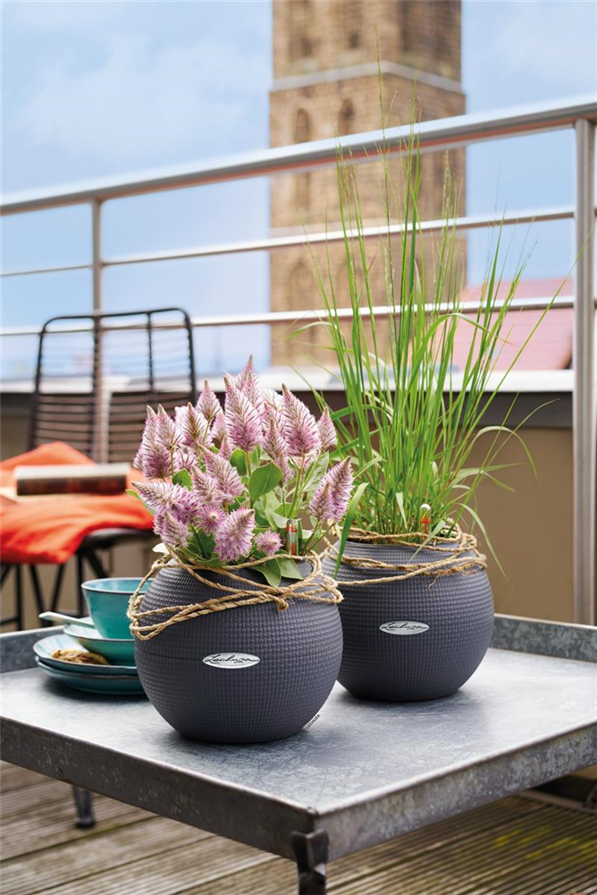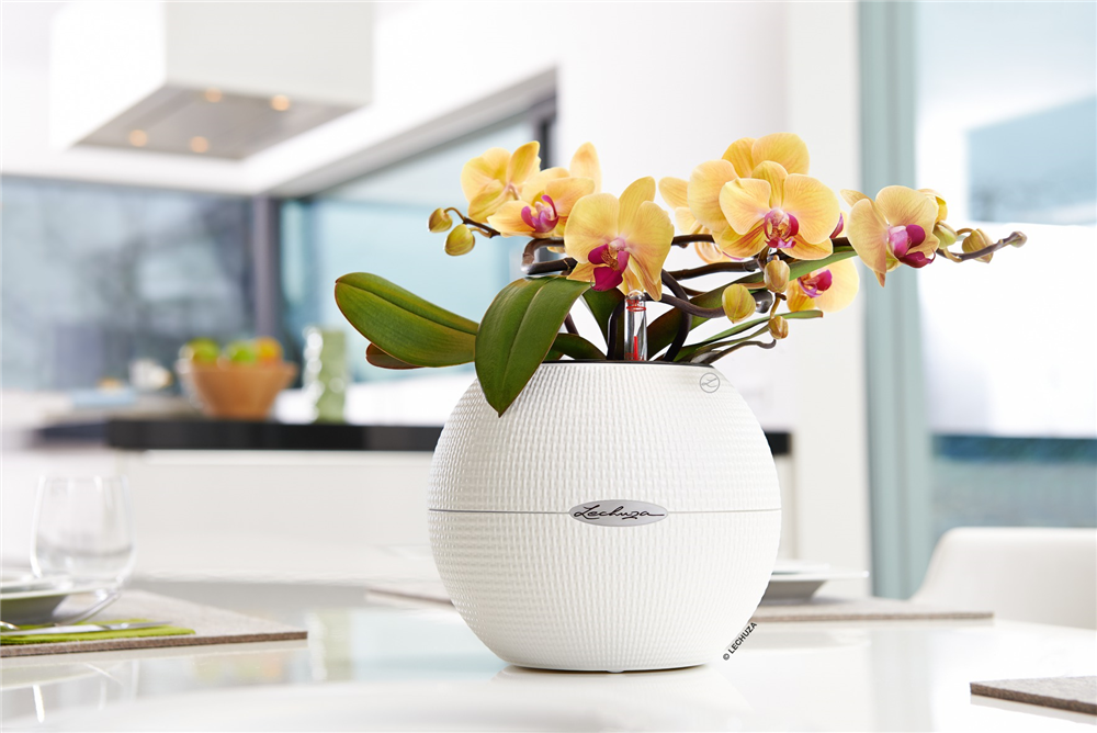 Das Pflanzgefäß LECHUZA-PURO Color 20 bildet mit der seidenmatten Oberfläche und der runden Form einen idealen Rahmen für Blüh- und Zimmerpflanzen auf dem Tisch.