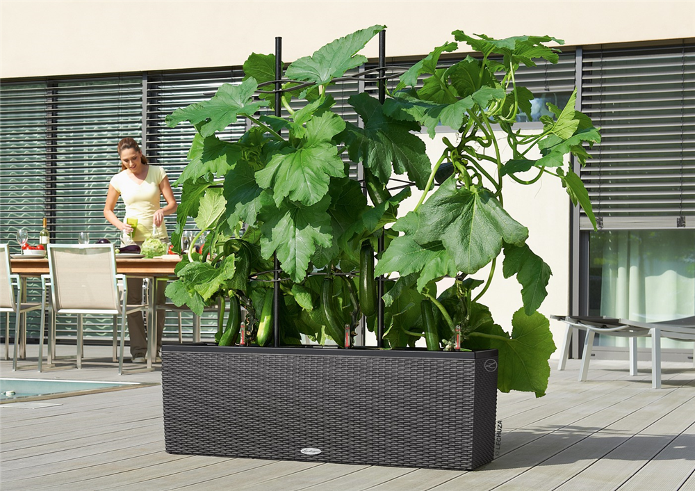 Für Gärten, Terrassen oder größere Balkone bietet sich TRIO als dekorativer Sichtschutz oder als Mini-Beet für rankende Obst- und Gemüsesorten an. Vor allem Tomaten und Auberginen gedeihen prächtig in den drei separat bepflanzbaren Einsätzen, für Stabilität sorgt ein optionales Rankgitter. In zarter Cottage-Optik kann sich TRIO dezent im Hintergrund halten oder als Blickfang fungieren.