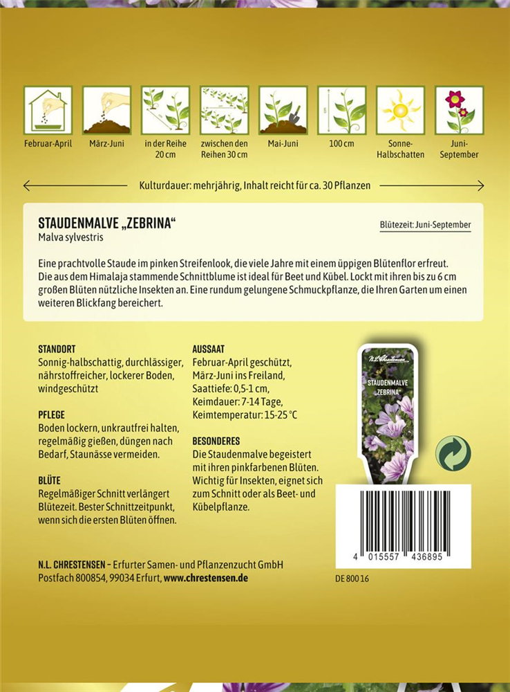 Die Garten-Malve 'Zebrina' (Malva sylvestris) ist eine aufrechte Staude, die von Juni bis September violette Blüten bildet. An einem sonnigen Standort mit humosem, nährstoffreichem Boden erreicht sie gewöhnlich eine Höhe von ca. 1 m und wird ca. 60 cm breit. Die Garten-Malve 'Zebrina' ist gut frostverträglich.