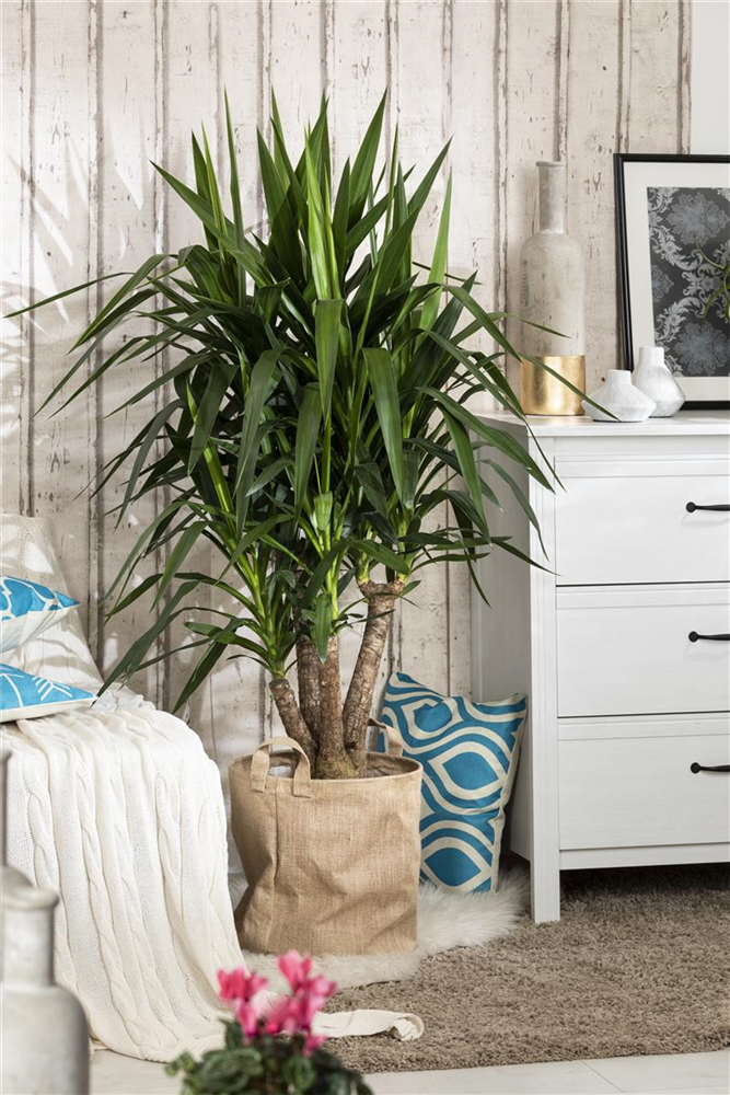 Die Riesen-Palmlilie (Yucca elephantipes) trägt dunkelgrüne, lineale, matte Blätter. Diese aufrechte Pflanze gedeiht am besten an einem sonnigen Standort.