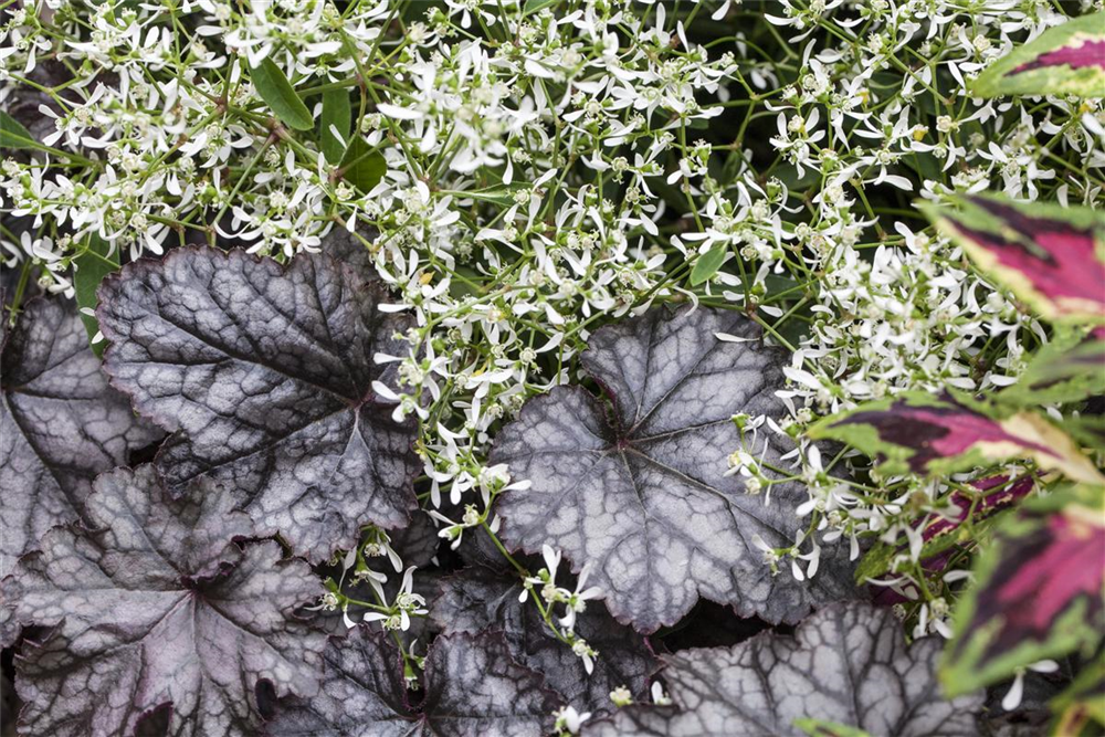 Das Purpurglöckchen (Heuchera) ist eine buschige, kompakte wintergrüne Staude mit dekorativen, rundlichen, silbrigen Blättern. An einem sonnigen bis halbschattigen Standort mit durchlässigem, nährstoffreichem Boden erreicht es gewöhnlich eine Höhe von ca. 30 cm und wird ca. 40 cm breit. Das Purpurglöckchen ist gut frostverträglich.