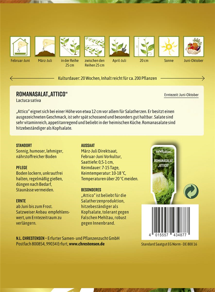 Der Romanasalat 'Attico' (Lactuca sativa) ist eine aromatisch schmeckende Gemüsepflanze. Seine Blätter können geerntet werden, sobald er ca. 20 erreicht hat. Für das optimale Wachstum des Romanasalats 'Attico' werden ein sonniger Standort und durchlässiger, nährstoffreicher Boden benötigt.