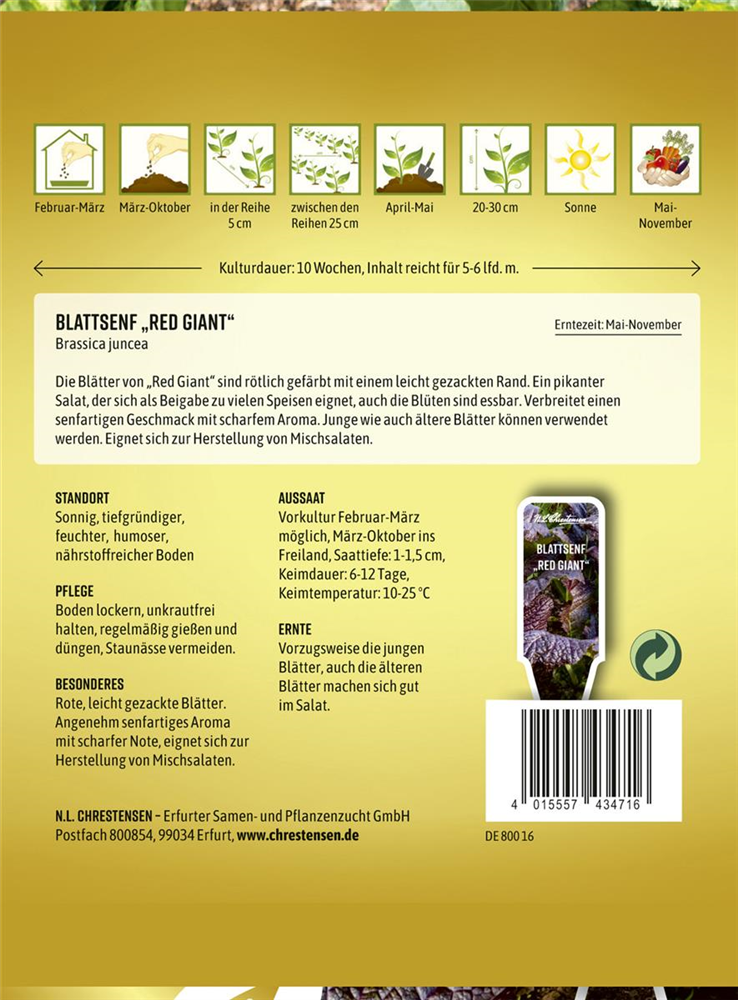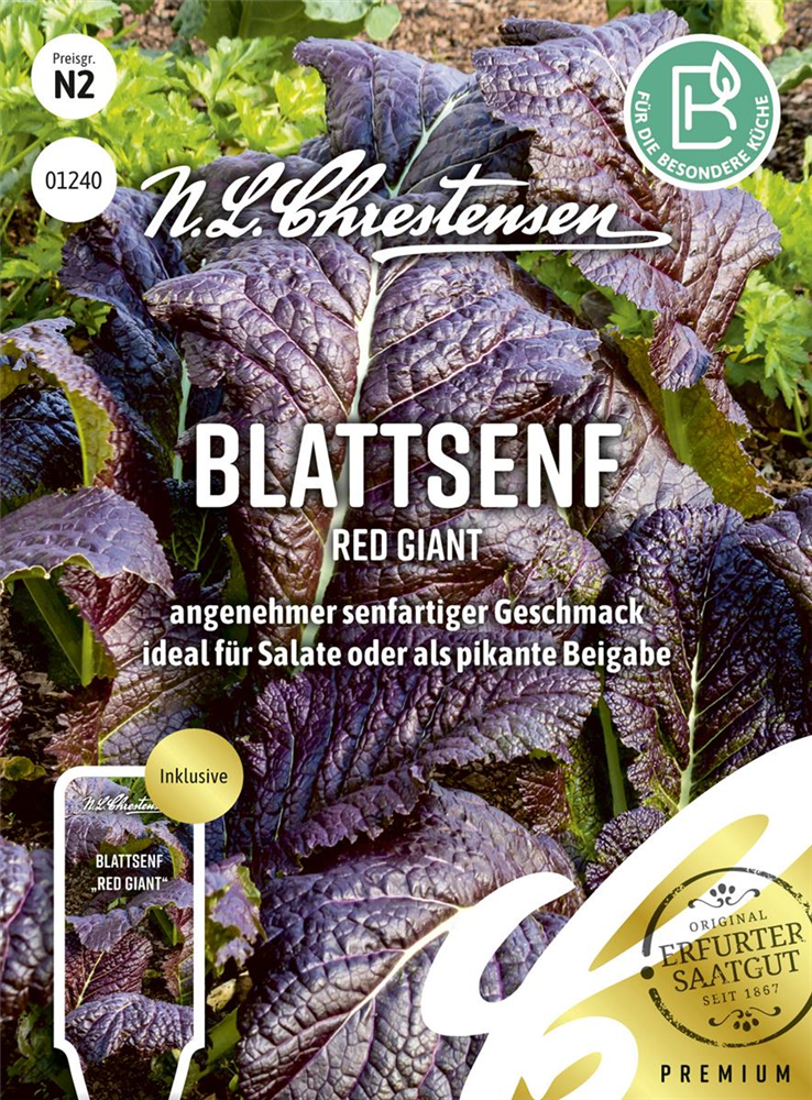 Der Rote Blattsenf (Brassica juncea) ist eine würzig, scharf schmeckende Gemüsepflanze. Seine Blätter können geerntet werden, sobald er ca. 20 erreicht hat. Für das optimale Wachstum des Roten Blattsenfs werden ein sonniger Standort und durchlässiger, nährstoffreicher Boden benötigt.