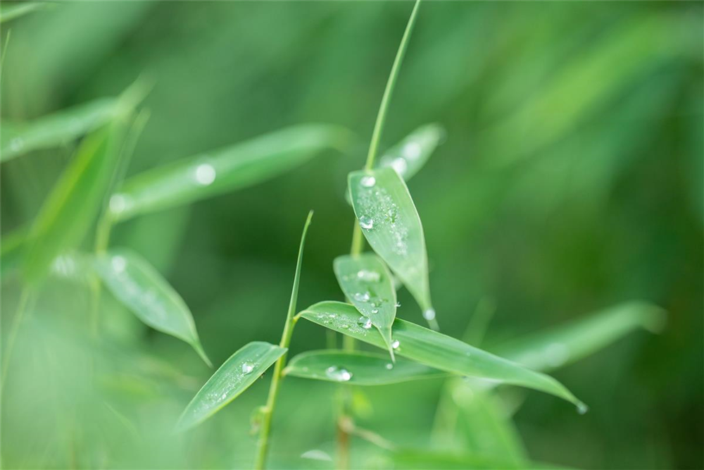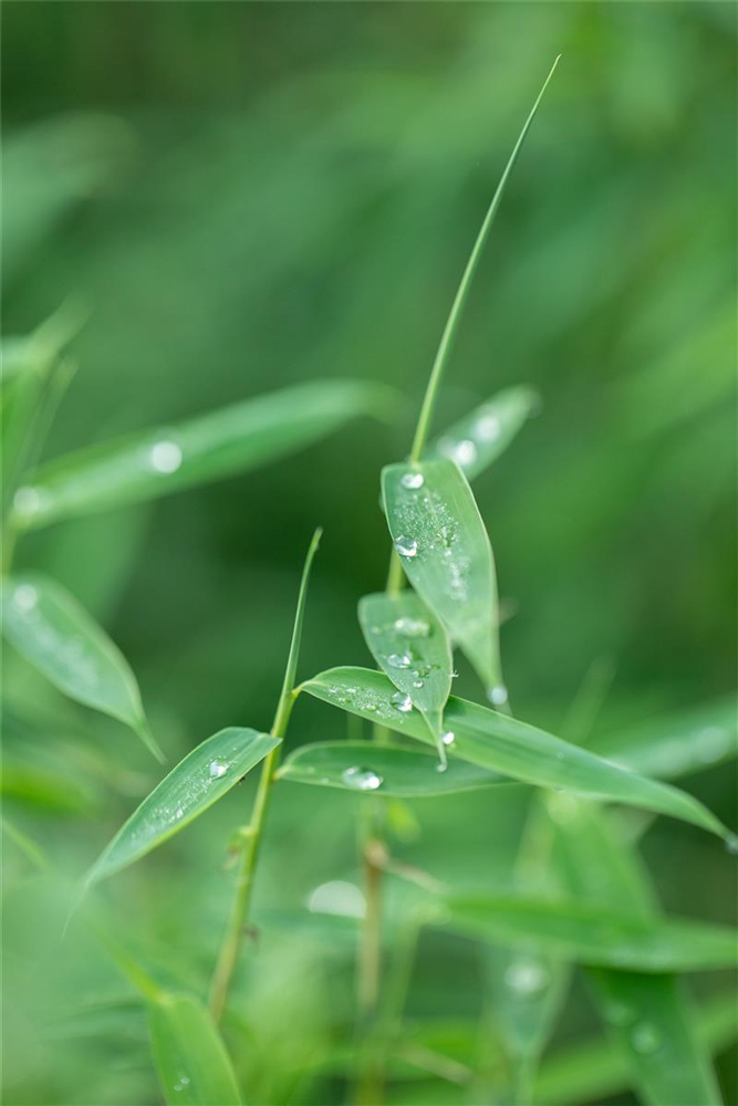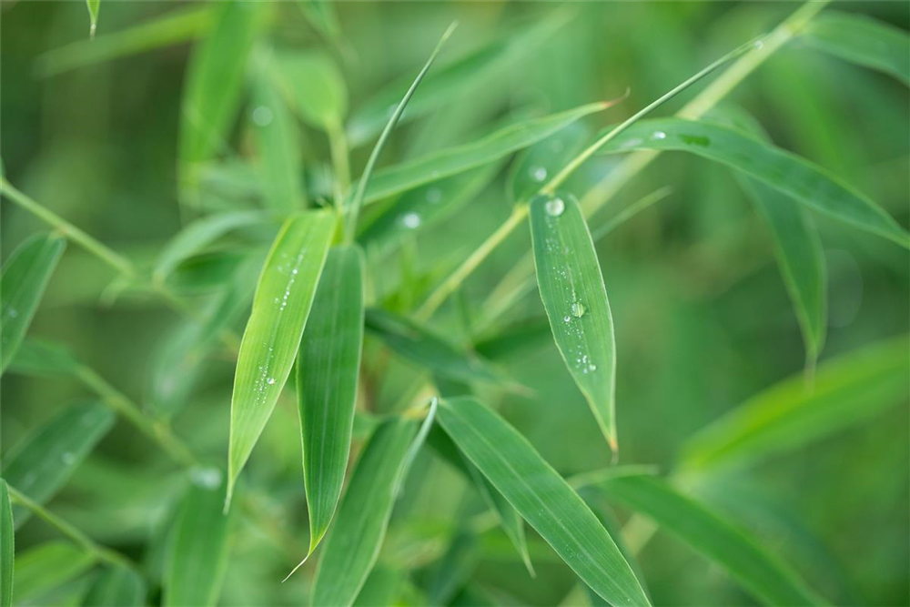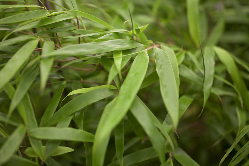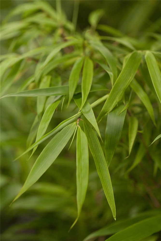 BlätterDie immergrünen Blätter des Schirmbambus sind dunkelgrün, lanzettlich.