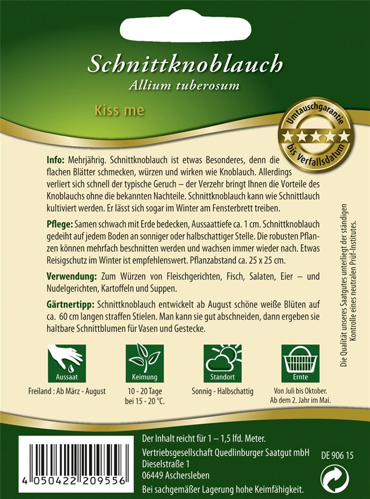 Der Schnittknoblauch 'Kiss Me' (Allium tuberosum) ist eine würzig schmeckende Gemüsepflanze. Seine Blätter können geerntet werden, sobald er ca. 20 erreicht hat. Für das optimale Wachstum des Schnittknoblauchs 'Kiss Me' werden ein sonniger Standort und durchlässiger, nährstoffreicher Boden benötigt.