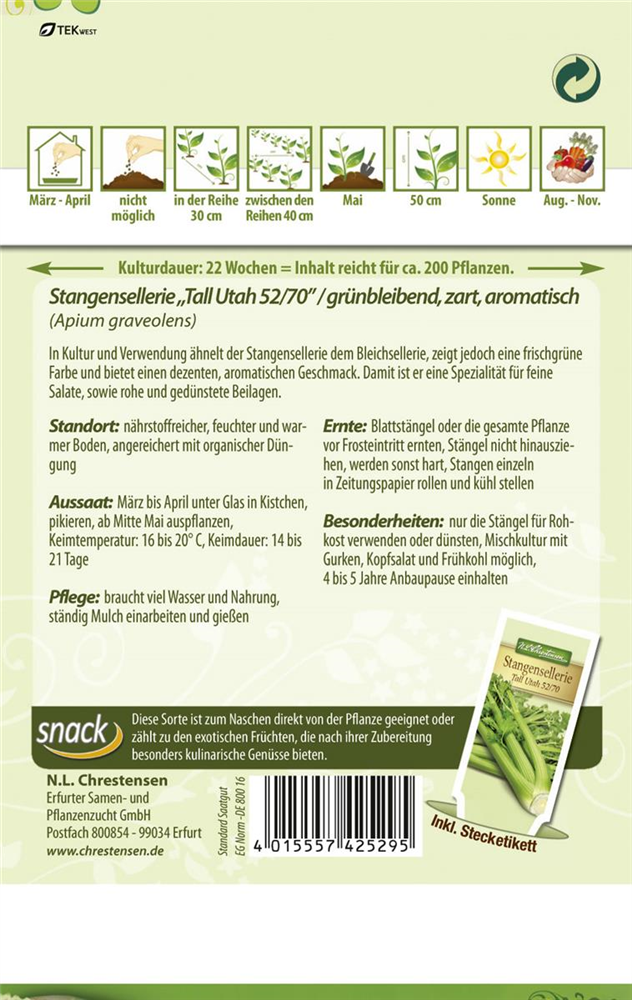 Der Stangensellerie 'Tall Utah 52/70' (Apium graveolens) ist eine würzig schmeckende Gemüsepflanze. Seine Blätter können geerntet werden, sobald er ca. 40 erreicht hat. Für das optimale Wachstum des Stangenselleries 'Tall Utah 52/70' werden ein sonniger Standort und durchlässiger, nährstoffreicher Boden benötigt.