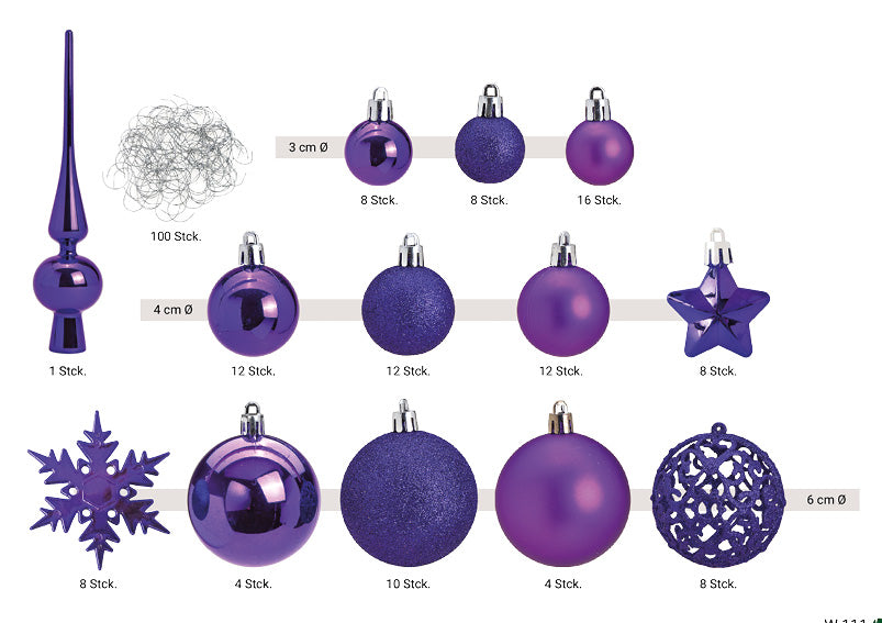 Plastic Christmas baubles, 111-piece set, Purple Ø3/4/6cm (W/H/D) 36x23x12cm. Color: Purple, Material: Plastic, Country of Origin: CN. Explore the product safety data sheet here: [Link]. In German: "Weihnachtskugeln aus Kunststoff, 111er-Set, Lila Ø3/4/6cm (B/H/T) 36x23x12cm. Farbe: Lila, Material: Kunststoff, Ursprungsland: CN. Produkt-Sicherheitsdatenblatt hier einsehen: [Link]."