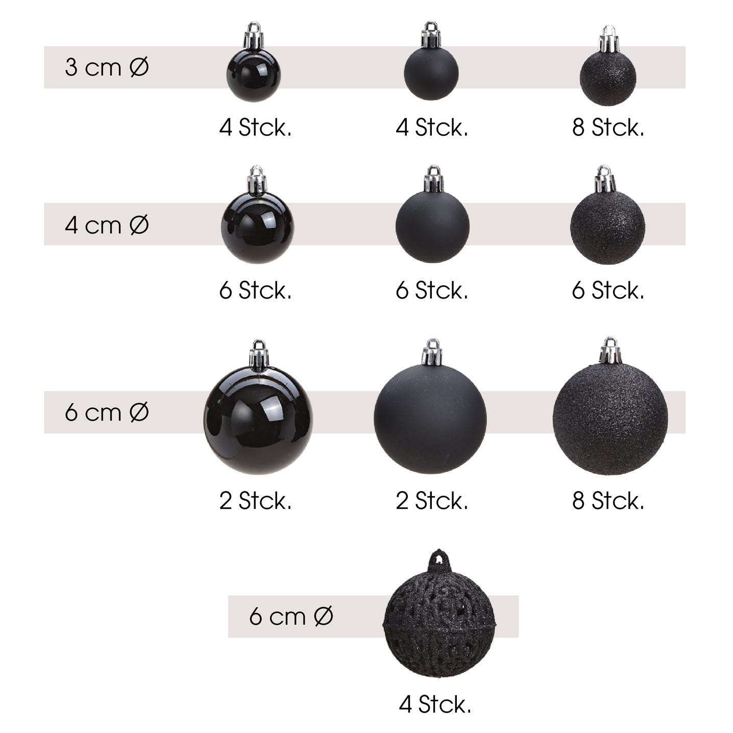 Weihnachtskugeln aus Kunststoff, 50er-Set, Schwarz Ø3/4/6cm (B/H/T) 23x18x12cm