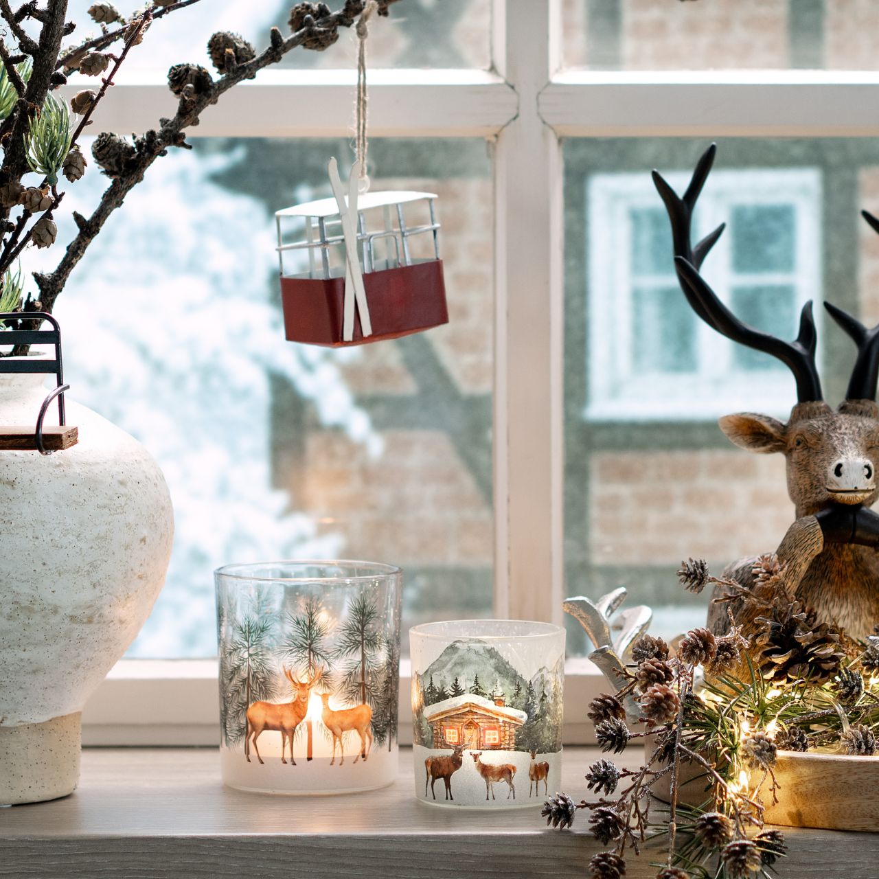 Windlicht mit Hirsch-Dekor aus Glas in Weiß und Gold (B/H/T) 15x15x15cm. Eigenschaften: Farbe Weiß, Material Glas, Herkunftsland CN. Produktsicherheitsdatenblatt: https://nextcloud.wurm.com/apps/psds/Documents/10032925.pdf