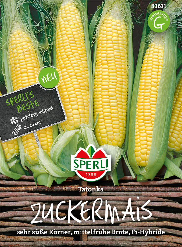 Der Zuckermais 'Tatonka F1' (Zea mays) bildet Samenkörner, die mehlig, süß schmecken und bereits ab August geerntet werden können. Für das optimale Wachstum des Zuckermaises 'Tatonka F1' werden ein sonniger Standort und durchlässiger, nährstoffreicher Boden benötigt.